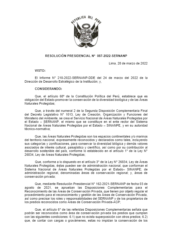 View Larger Image RESOLUCION PRESIDENCIAL N 087-2022-SERNANP.pdf RESOLUCION PRESIDENCIAL N 087-2022-SERNANP.pdf Anais Gonzales2022-04-21T12:33:44-05:00