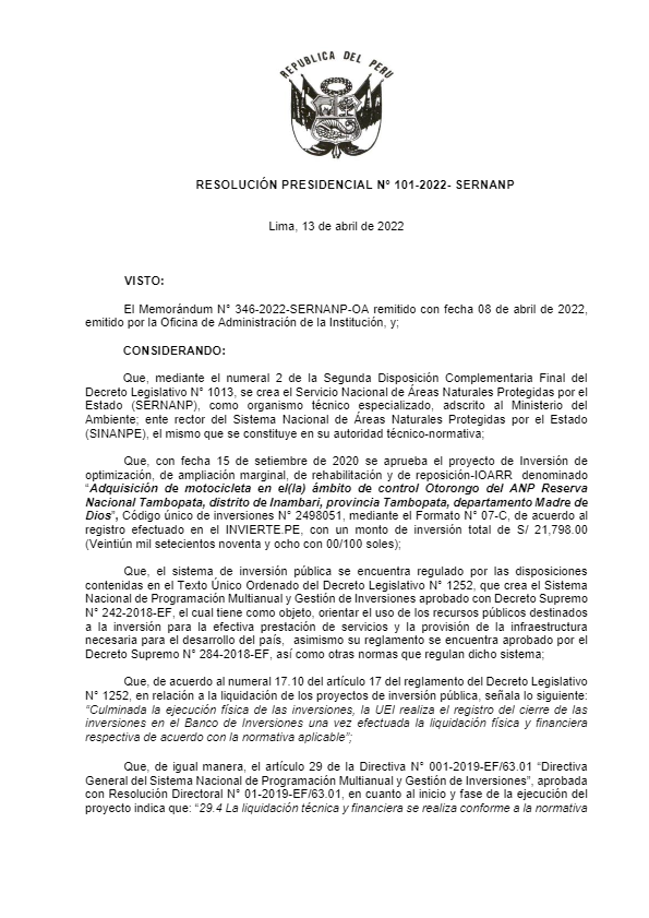 View Larger Image RESOLUCION PRESIDENCIAL N 101-2022-SERNANP.pdf RESOLUCION PRESIDENCIAL N 101-2022-SERNANP.pdf Anais Gonzales2022-04-21T11:05:36-05:00