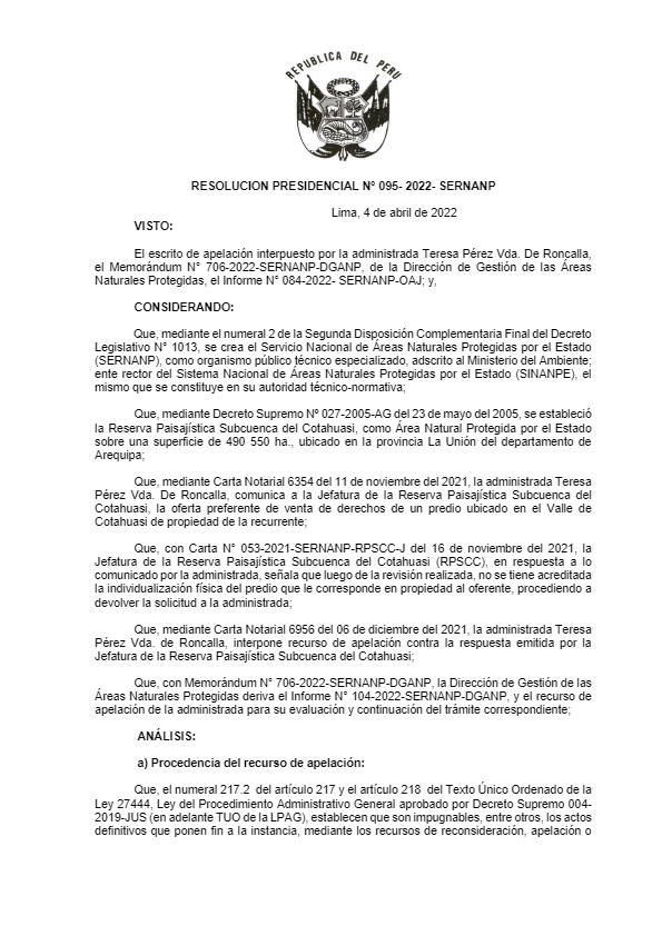 View Larger Image RESOLUCION PRESIDENCIAL N 095-2022-SERNANP.pdf RESOLUCION PRESIDENCIAL N 095-2022-SERNANP.pdf Anais Gonzales2022-04-21T11:53:38-05:00