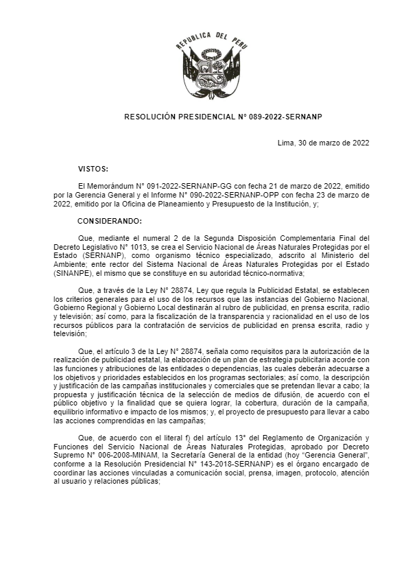 View Larger Image RESOLUCION PRESIDENCIAL N 089-2022-SERNANP.pdf RESOLUCION PRESIDENCIAL N 089-2022-SERNANP.pdf Anais Gonzales2022-04-21T12:27:29-05:00