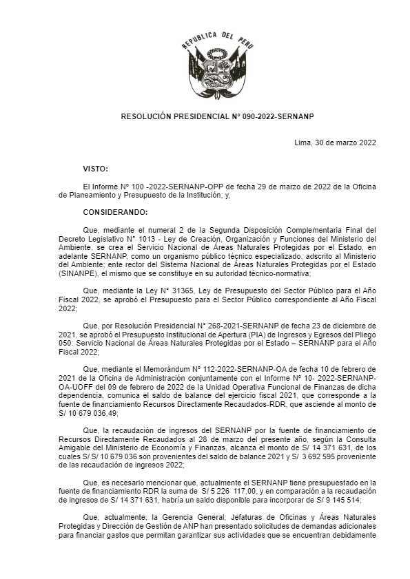 View Larger Image RESOLUCION PRESIDENCIAL N 090-2022-SERNANP.pdf RESOLUCION PRESIDENCIAL N 090-2022-SERNANP.pdf Anais Gonzales2022-04-21T12:30:19-05:00