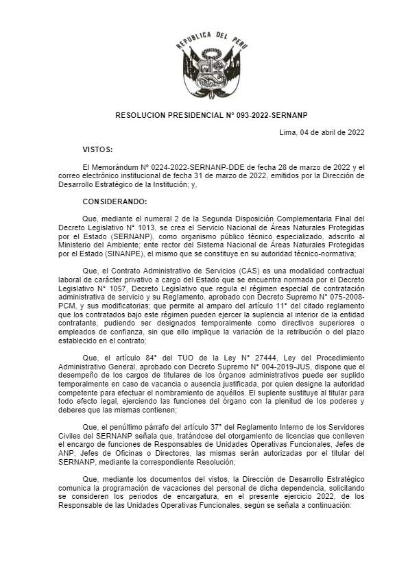 View Larger Image RESOLUCION PRESIDENCIAL N 093-2022-SERNANP.pdf RESOLUCION PRESIDENCIAL N 093-2022-SERNANP.pdf Anais Gonzales2022-04-21T11:54:51-05:00