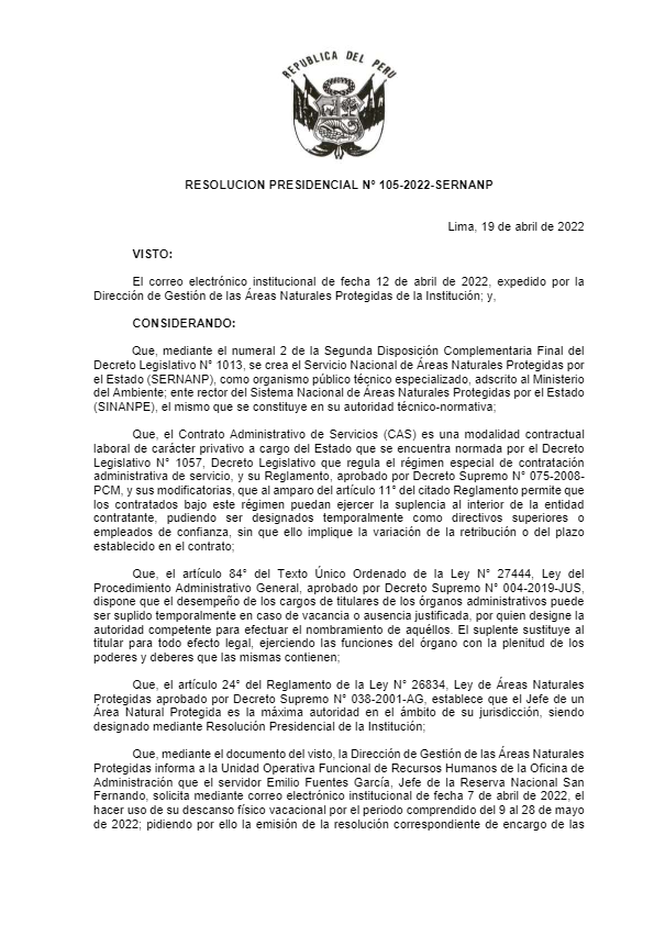 View Larger Image RESOLUCION PRESIDENCIAL N 105-2022-SERNANP.pdf RESOLUCION PRESIDENCIAL N 105-2022-SERNANP.pdf Anais Gonzales2022-04-21T10:20:40-05:00